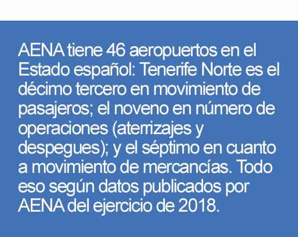 AENA tiene 46 aeropuertos en el Estado español: Tenerife Norte es el décimo tercero en movimiento de pasajeros; el noveno en número de operaciones (aterrizajes y despegues); y el séptimo en cuanto a movimiento de mercancías. Todo eso según datos publicados por AENA del ejercicio de 2018. Ya no son pocas personas, son una media de quince mil las que pasan diariamente por Los Rodeos.