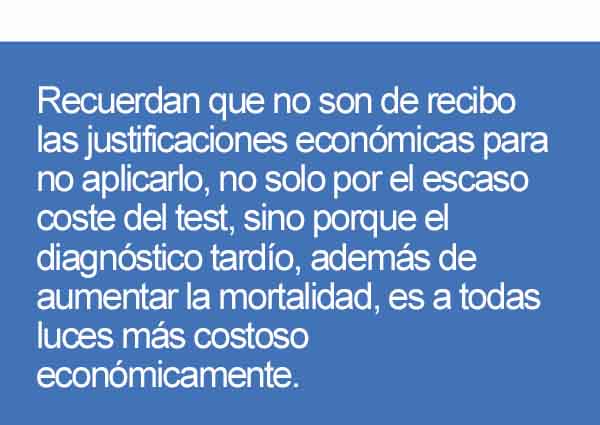 Recuerdan que no son de recibo las justificaciones económicas para no aplicarlo, no solo por el escaso coste del test, sino porque el diagnóstico tardío, además de aumentar la mortalidad, es a todas luces más costoso económicamente.