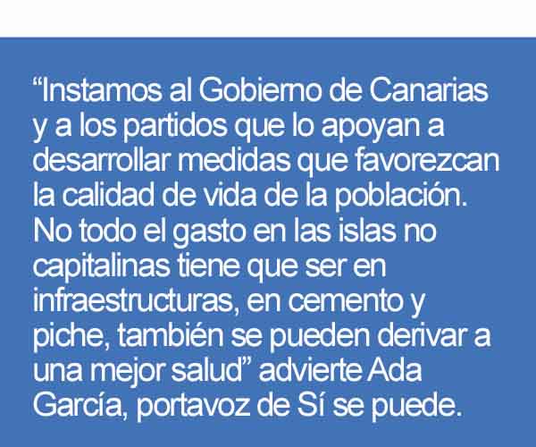 “Instamos al Gobierno de Canarias y a los partidos que lo apoyan a desarrollar medidas que favorezcan la calidad de vida de la población. No todo el gasto en las islas no capitalinas tiene que ser en infraestructuras, en cemento y piche, también se pueden derivar a una mejor salud” advierte Ada García, portavoz de Sí se puede.