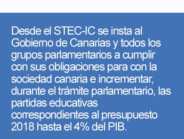 Desde el STEC-IC se insta al Gobierno de Canarias y todos los grupos parlamentarios a cumplir con sus obligaciones para con la sociedad canaria e incrementar, durante el trámite parlamentario, las partidas educativas correspondientes al presupuesto 2018 hasta el 4% del PIB.
