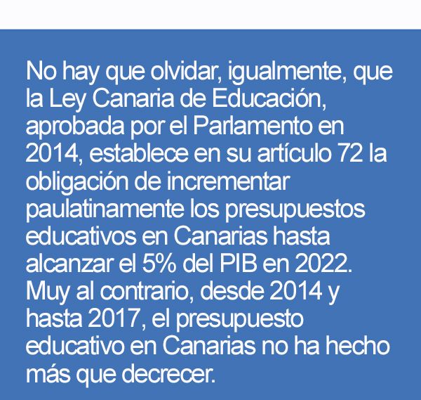 No hay que olvidar, igualmente, que la Ley Canaria de Educación, aprobada por el Parlamento en 2014, establece en su artículo 72 la obligación de incrementar paulatinamente los presupuestos educativos en Canarias hasta alcanzar el 5% del PIB en 2022. Muy al contrario, desde 2014 y hasta 2017, el presupuesto educativo en Canarias no ha hecho más que decrecer.