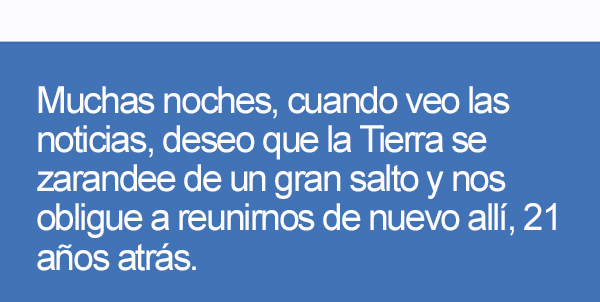 Muchas noches, cuando veo las noticias, deseo que la Tierra se zarandee de un gran salto y nos obligue a reunirnos de nuevo allí, 21 años atrás. Quizás podríamos, entonces, volver a ser unos chiquillos y solucionar, con el lenguaje de la ilusión, lo que no se consigue en palacios huecos ni trincheras agonizantes.