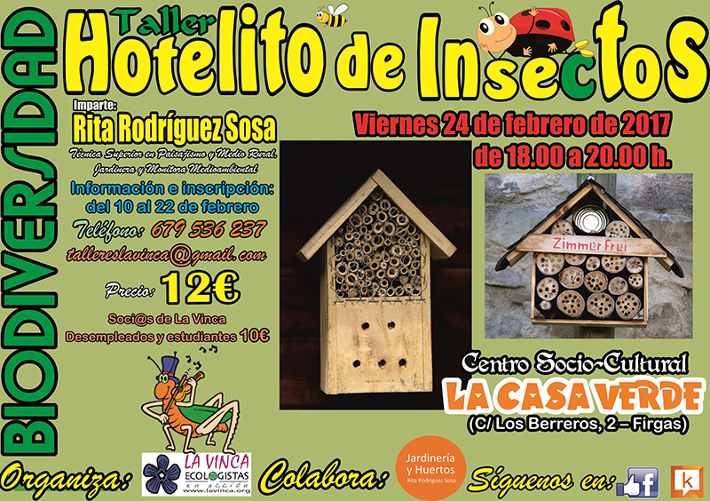 A partir de las 9.00 horas del viernes 10 de febrero se abre el plazo de inscripción para el TALLER “HOTELITO DE INSECTOS”, bajo la organización de LA VINCA Ecologistas en Acción, contando con la colaboración de Jardinería y Huertos Rita Rodríguez Sosa. Las personas interesadas en asistir al mismo pueden inscribirse llamando al teléfono 679 536 237 (Comisión de Formación de La Vinca EeA).