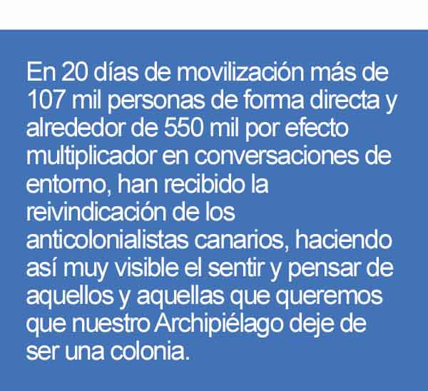 En la tarde del miércoles 25 de julio, miles de activistas anticolonialistas canarios hicieron llegar la voz y la causa de la descolonización a decenas de miles de personas. Así lo testimonian los datos y estadísticas que nos ofrece Facebook para mayor rigor y testimonio de veracidad. En 20 días de movilización más de 107 mil personas de forma directa y alrededor de 550 mil por efecto multiplicador en conversaciones de entorno, han recibido la reivindicación de los anticolonialistas canarios, haciendo así muy visible el sentir y pensar de aquellos y aquellas que queremos que nuestro Archipiélago deje de ser una colonia.