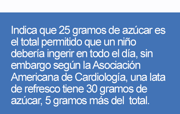 Indica que 25 gramos de azúcar es el total permitido que un niño debería ingerir en todo el día, sin embargo según la Asociación Americana de Cardiología, una lata de refresco tiene 30 gramos de azúcar, 5 gramos más del total. Por su parte la Organización Mundial de la Salud (OMS) en su informe “Las políticas fiscales para la dieta y la prevención de Enfermedades No Transmisibles” (ENT) recomienda que los impuestos sobre las bebidas azucaradas se aumenten al menos un 20%, con el objetivo de reducir su consumo y, por tanto, disminuir el riesgo de obesidad, diabetes tipo 2 y caries dental.