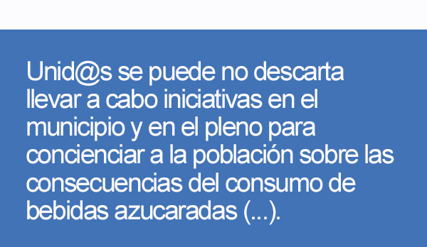 Unid@s se puede no descarta llevar a cabo iniciativas en el municipio y en el pleno para concienciar a la población sobre las consecuencias del consumo de bebidas azucaradas sobre la Salud y que se lleven a cabo políticas fiscales, ya que según la propia OMS, “el aumento de al menos el 20% del precio de venta al público de las bebidas azucaradas podrían redundar en una reducción proporcional del consumo de estos productos”, finaliza Roca.