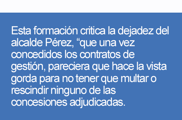 Esta formación critica la dejadez del alcalde Pérez, “que una vez concedidos los contratos de gestión, pareciera que hace la vista gorda para no tener que multar o rescindir ninguno de las concesiones adjudicadas. Seguimos sin tener claridad con respecto a la maquinaria que URBASER se comprometió a utilizar al ganar el concurso, y que podría asumir con el canon de cerca de 17.000€ mensuales que recibe”.