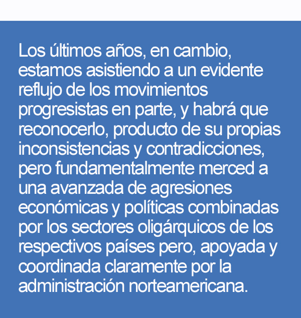 Los últimos años, en cambio, estamos asistiendo a un evidente reflujo de los movimientos progresistas en parte, y habrá que reconocerlo, producto de su propias inconsistencias y contradicciones, pero fundamentalmente merced a una avanzada de agresiones económicas y políticas combinadas por los sectores oligárquicos de los respectivos países pero, apoyada y coordinada claramente por la administración norteamericana. En este sentido, la batalla que se libra en estos días en las calles de Caracas es fundamental para dilucidar el futuro de los procesos continentales y no puede dejar indiferente a nadie.