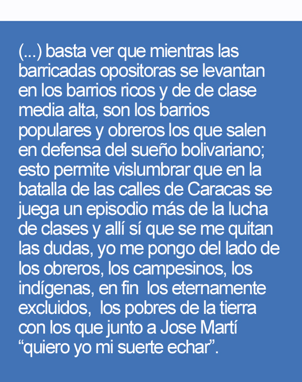 Porque ante una oposición violenta que no tiene reparos en quemar gente en las calles y que en el fondo, pretende una regresión al neoliberalismo al estilo de Macri o Temer, además de entregarle los recursos naturales y posiciones estratégicas a Estados Unidos y en contra un gobierno que aún con sus errores y deficiencias es no solamente legal y legítimo sino representante de las clases populares en rebeldía que levantaron y levantan las banderas de la esperanza en un futuro distinto, me queda claro con quien hay que estar. Porque además y, probablemente esto sea lo más importante,  basta ver que mientras las barricadas opositoras se levantan en los barrios ricos y de de clase media alta, son los barrios populares y obreros los que salen en defensa del sueño bolivariano; esto permite vislumbrar que en la batalla de las calles de Caracas se juega un episodio más de la lucha de clases y allí sí que se me quitan las dudas, yo me pongo del lado de los obreros, los campesinos, los indígenas, en fin  los eternamente excluidos,  los pobres de la tierra con los que junto a Jose Martí “quiero yo mi suerte echar”. Yo tomo partido por la revolución bolivariana, partido hasta mancharme.