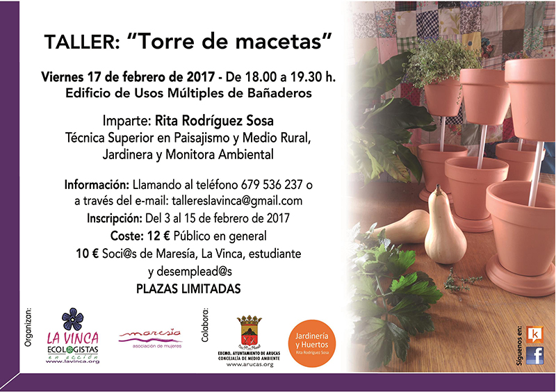 El viernes 3 de febrero de 2017 se ha abierto el plazo de inscripción para el TALLER “TORRE DE MACETAS”, bajo la organización de LA VINCA Ecologistas en Acción y la Asociación de Mujeres MARESÍA, contando con la colaboración de la Concejalía de Medio Ambiente del Ayuntamiento de Arucas y Jardinería y Huertos Rita Rodríguez Sosa. Las personas interesadas en asistir al mismo pueden inscribirse llamando al teléfono 679 536 237 (Comisión de Formación de LA VINCA EeA).